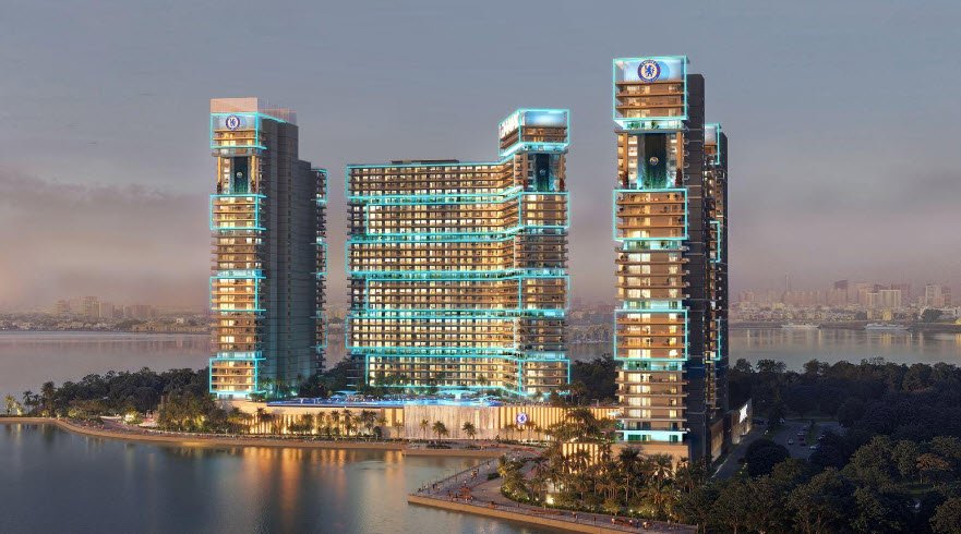 Architecturally, Chelsea Tower features a sleek modern design with a distinctive roof structure and is clad in blue-grey glass and white aluminum panels, giving it elegant proportions and a visually arresting presence along Dubai’s Sheikh Zayed Road.