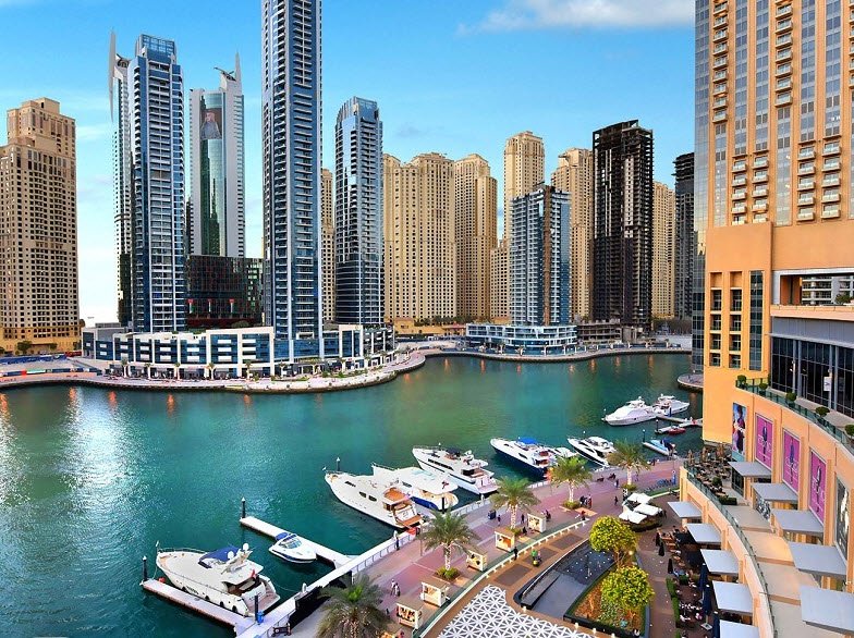 Dubai Marina features a blend of upscale residential buildings, commercial outlets, waterfront restaurants, and leisure options, including the prominent Jumeirah Beach Residence and the Marina Walk. The district stands out for its striking skyline, diverse architectural styles, and pedestrian-friendly urban design.