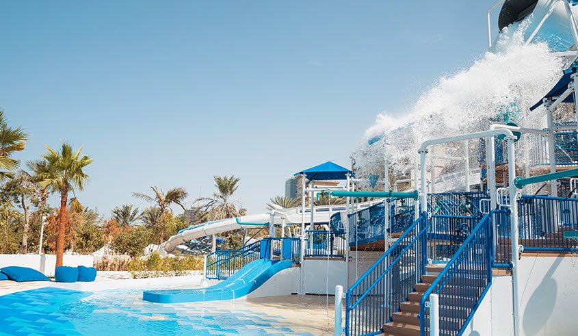 For younger visitors, the park offers gentle kids’ slides and the Aqua Play structure, an interactive multi-level splash maze with water cannons and tipping buckets. The six-meter pneumatic wave pool provides family-friendly splashing fun, while the nearby private beach offers a tranquil setting alongside the Arabian Gulf’s azure waters.