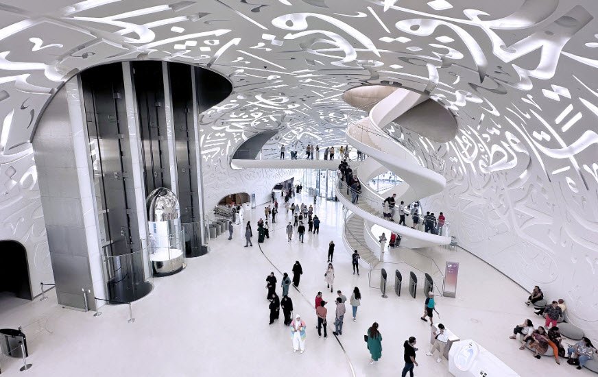 The museum’s striking 77-meter-high torus-shaped building features a stainless steel façade adorned with Arabic calligraphy, including passages from Sheikh Mohammed’s poem about the future. This architectural marvel not only symbolizes the fusion of heritage and technology but also represents Dubai’s ambition to be a global hub for innovation.