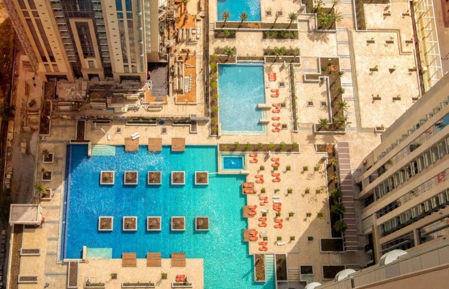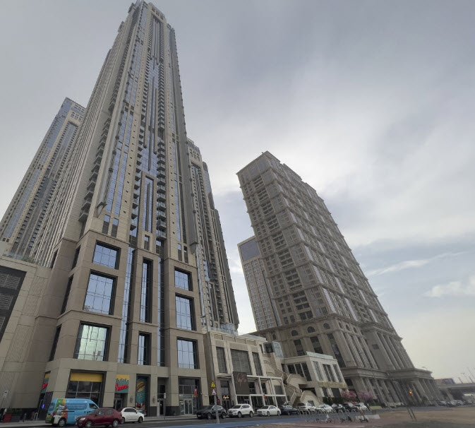 Residents of Noora Tower benefit from a wide array of modern amenities, including a 120,000-square-foot leisure deck with a large infinity pool, a fitness center with state-of-the-art equipment, a clubhouse, health clinics, a daycare center, and a supermarket.