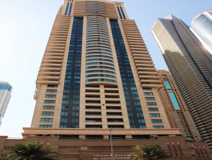 Al Seef Tower is a luxurious residential skyscraper situated in the Dubai Marina district of Dubai, United Arab Emirates. The tower stands 44 stories tall with a height of approximately 215 meters (705 feet) and was completed in 2005 by developer Deyaar Development PJSC.