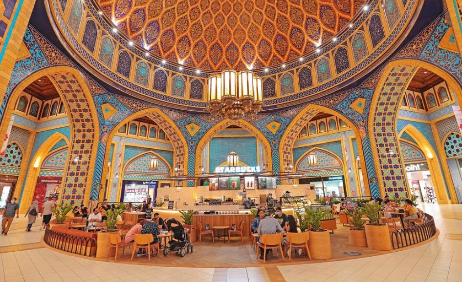 The mall is distinctive for its design inspired by the travels of Ibn Battuta, featuring six themed courts: Andalusia, Tunisia, Egypt, Persia, India, and China. Each court reflects the architecture and culture of the regions Ibn Battuta visited during his extensive journeys, including notable features such as a replica of an elephant clock in the India Court, a large hand-painted dome in the Persia Court, and pyramids in the Egypt Court.