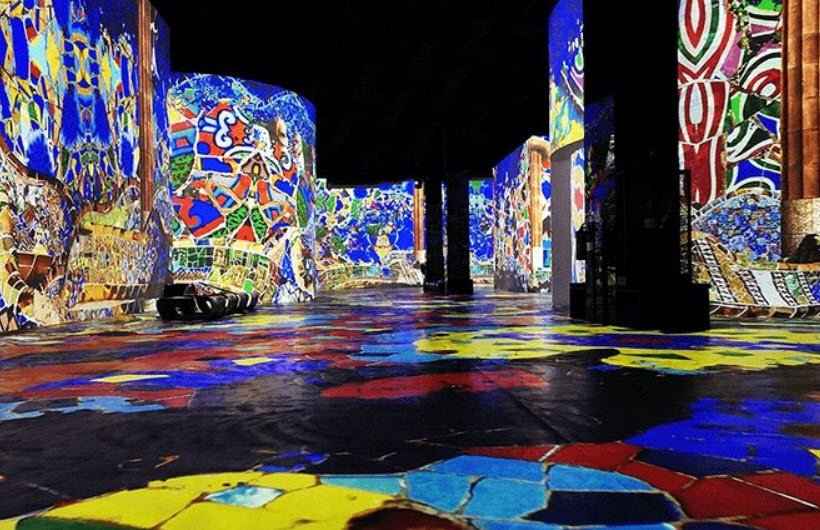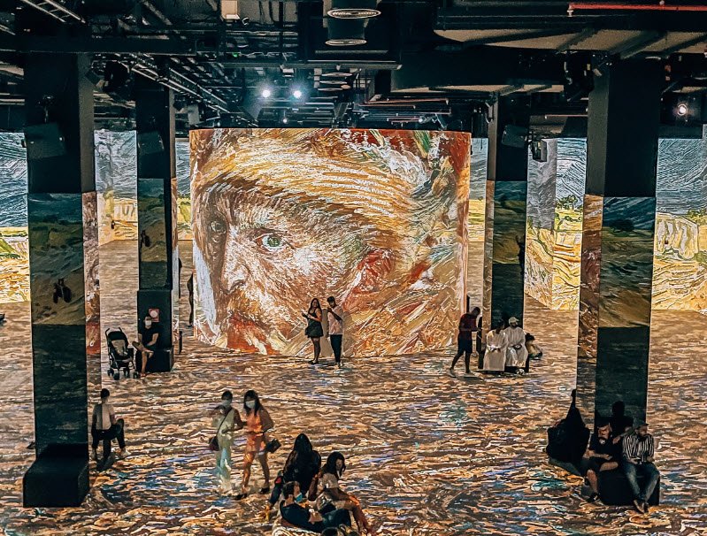 Visitors experience an audiovisual journey that transforms the surrounding walls and floors into dynamic canvases, offering a unique way to engage with art through animation, sound, and large-scale projections.