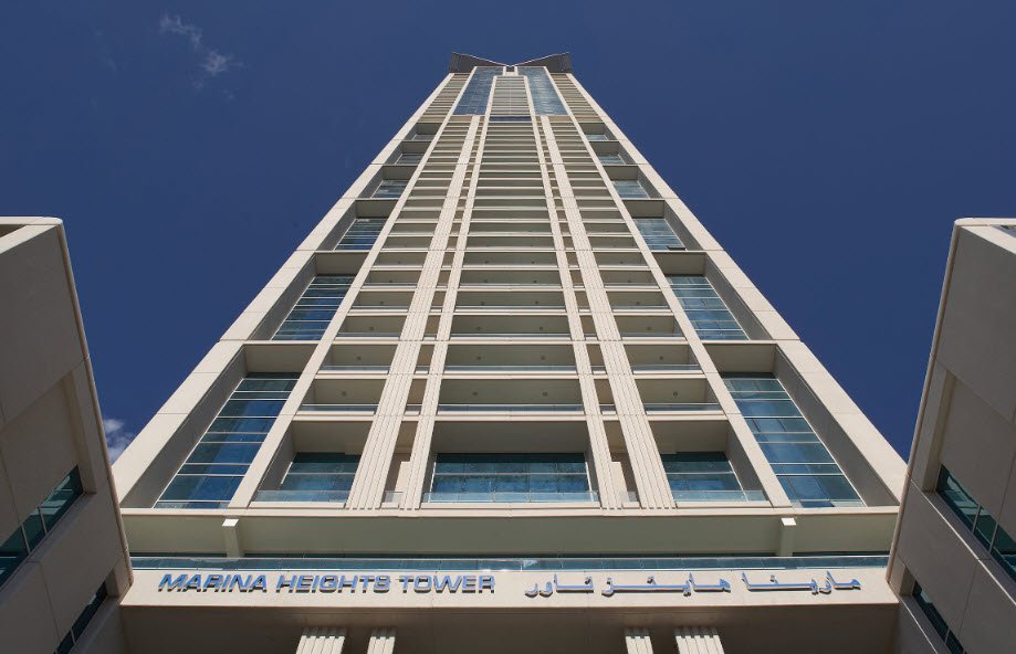 Marina Heights Tower is a 55-story residential skyscraper located in the Dubai Marina district of Dubai, United Arab Emirates. Completed in 2006 and developed by Abdul Salam Al Rafi Group, and designed by RMJM Dubai, the tower stands approximately 208 meters (684 feet) tall.
